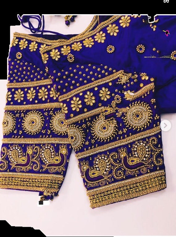 Blue Kundan And Beads Work Maggam Blouse Etsy Canada